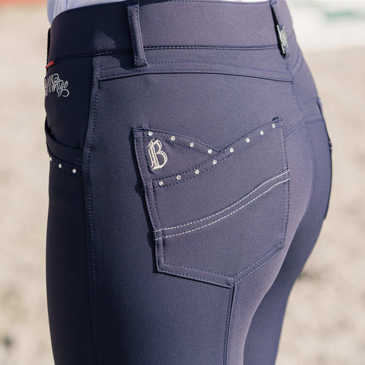 Pantalon Vertigo Olivia de Horze pour femmes. Les coutures disposées latéralement ou au dos, et non pas sur l’avant la rendent extrêmement confortable car elle ne fait aucun pli ni ne s’appuie sur les articulations. Basanes aux genoux avec silicone de qualité. Coupe améliorée au niveau des mollets. Le matériau bénéficie d’une protection anti UV (UPF 50+). Matière extensible dans tous les sens. Hauteur de taille moyenne. Couleur : marine.